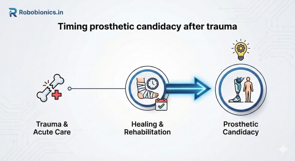 This article explains the clinical criteria for prosthetic candidacy after trauma amputation, using a clear and practical approach suited to real hospitals and rehabilitation settings in India. It focuses on medical safety, functional readiness, emotional recovery, and real-life demands, so that prosthetic decisions support healing rather than rush it.